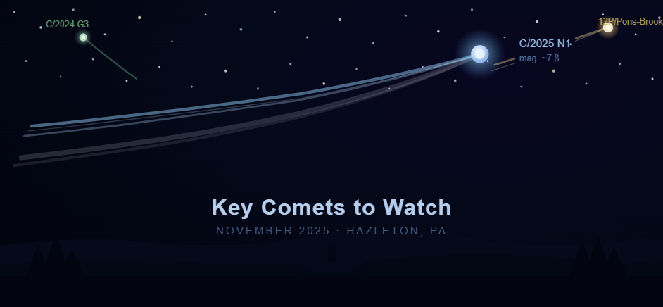 Here are some notable comets to keep an eye on for November 2025, from your northern-hemisphere location (Hazleton, PA) and